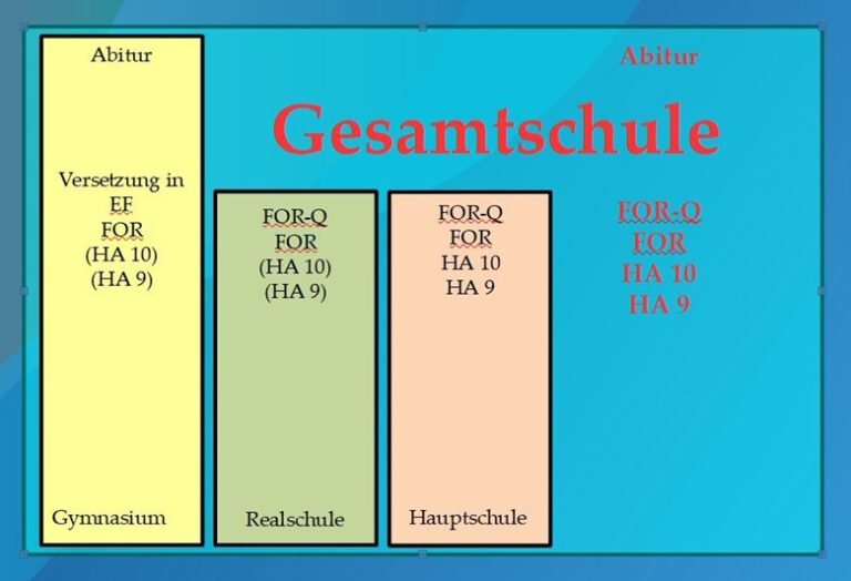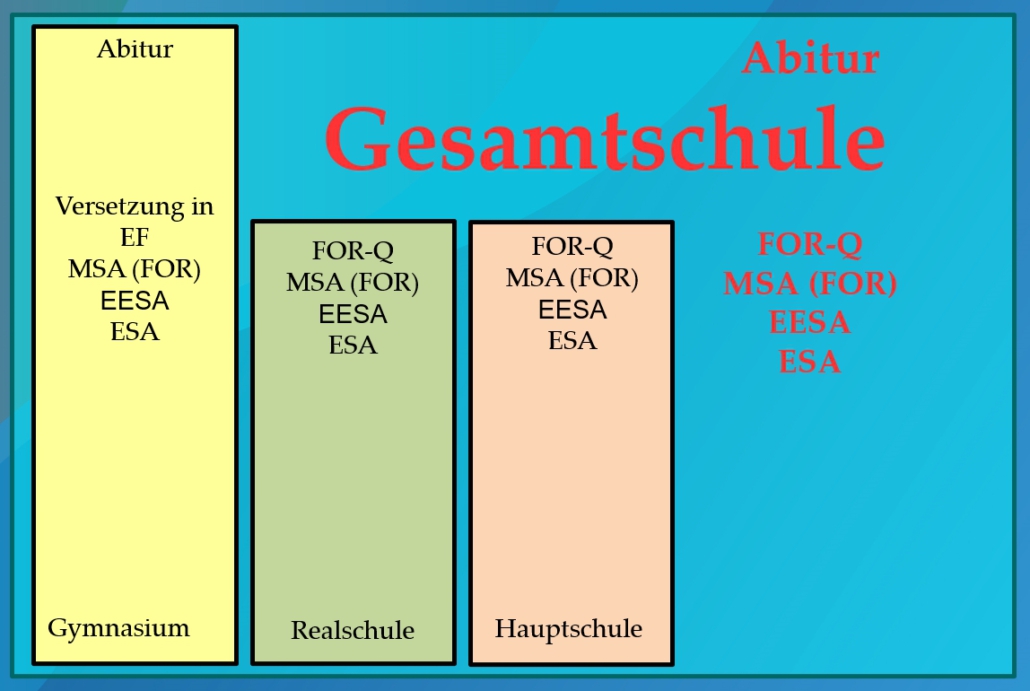 Vom ersten Schulabschluss (ESA) am Ende der Klasse 9, über den erweiterten ersten Schulabschluss (EESA) oder den mittleren Schulabschluss (MSA) nach Klasse 10 bietet eine Gesamtschule jeden Abschluss, der in der Sekundarstufe I, das sind die Klassen 5-10, erreicht werden kann.