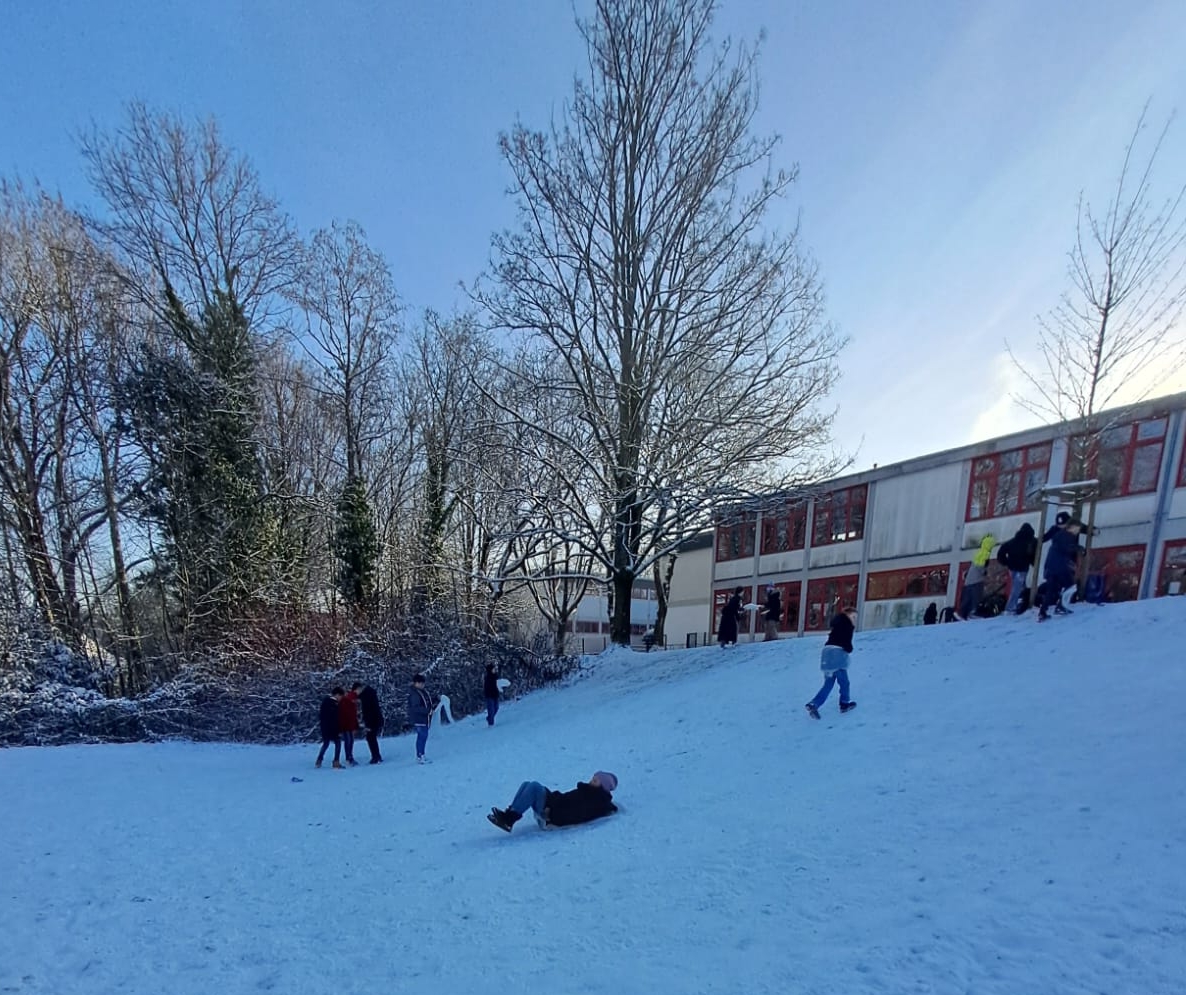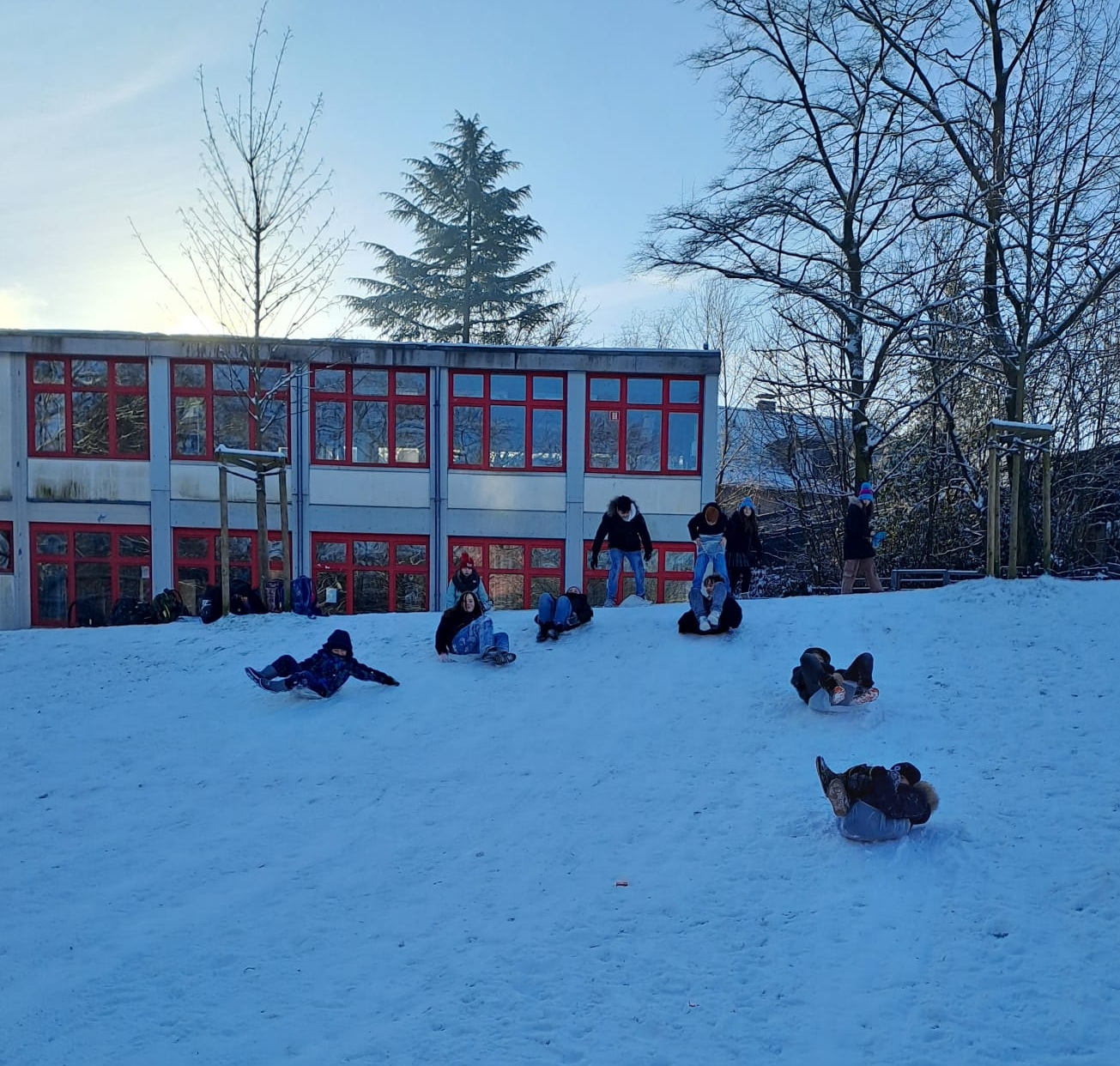 Antwort: Die aufsichtführenden Lehrkräfte rufen eine Challenge aus: Wie kommt man trocken den Hügel im Park runter? Die Lösung kann man den Bildern entnehmen 😎