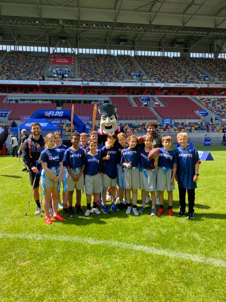 Erst haben wir uns um 7:30 vor der Schule getroffen. Von dort sind wir ins Fortunastadion gefahren, wo das NFL Flag Turnier stattgefunden hat. Wir gingen zusammen ins Stadion und haben Trikots und Hosen bekommen. Wir mussten uns beeilen, da wir unter Zeitdruck waren. Alle haben sich umgezogen und sind aufs Spielfeld gegangen. Dort wurde uns alle erklärt und wir haben uns anschließend gemeinsam mit dem Gegnerteam aufgewärmt.